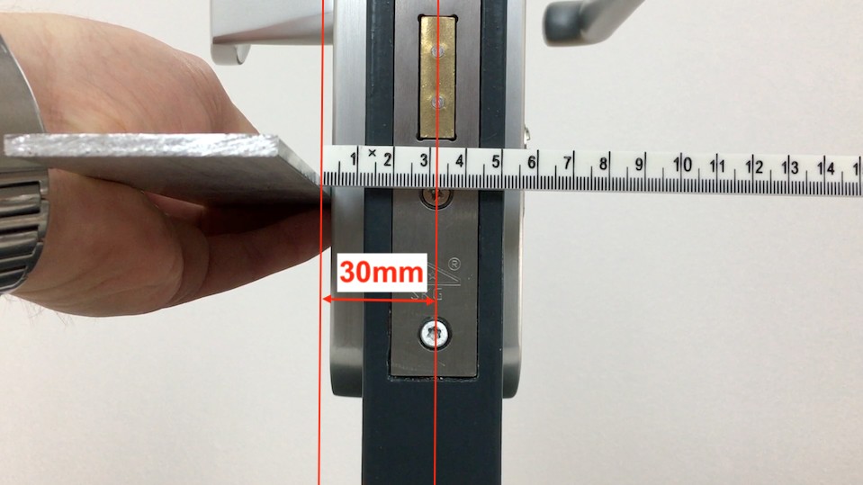 Herhaal deze stap voor de binnenkant van het  deurbeslag en meet met een duimstok of rolmaat vanaf het vlakke materiaal dat je tegen het beslag aan houdt tot het hart van de cilinderschroef. In onderstaand voorbeeld is de maat van zijde B, binnenzijde 30mm.